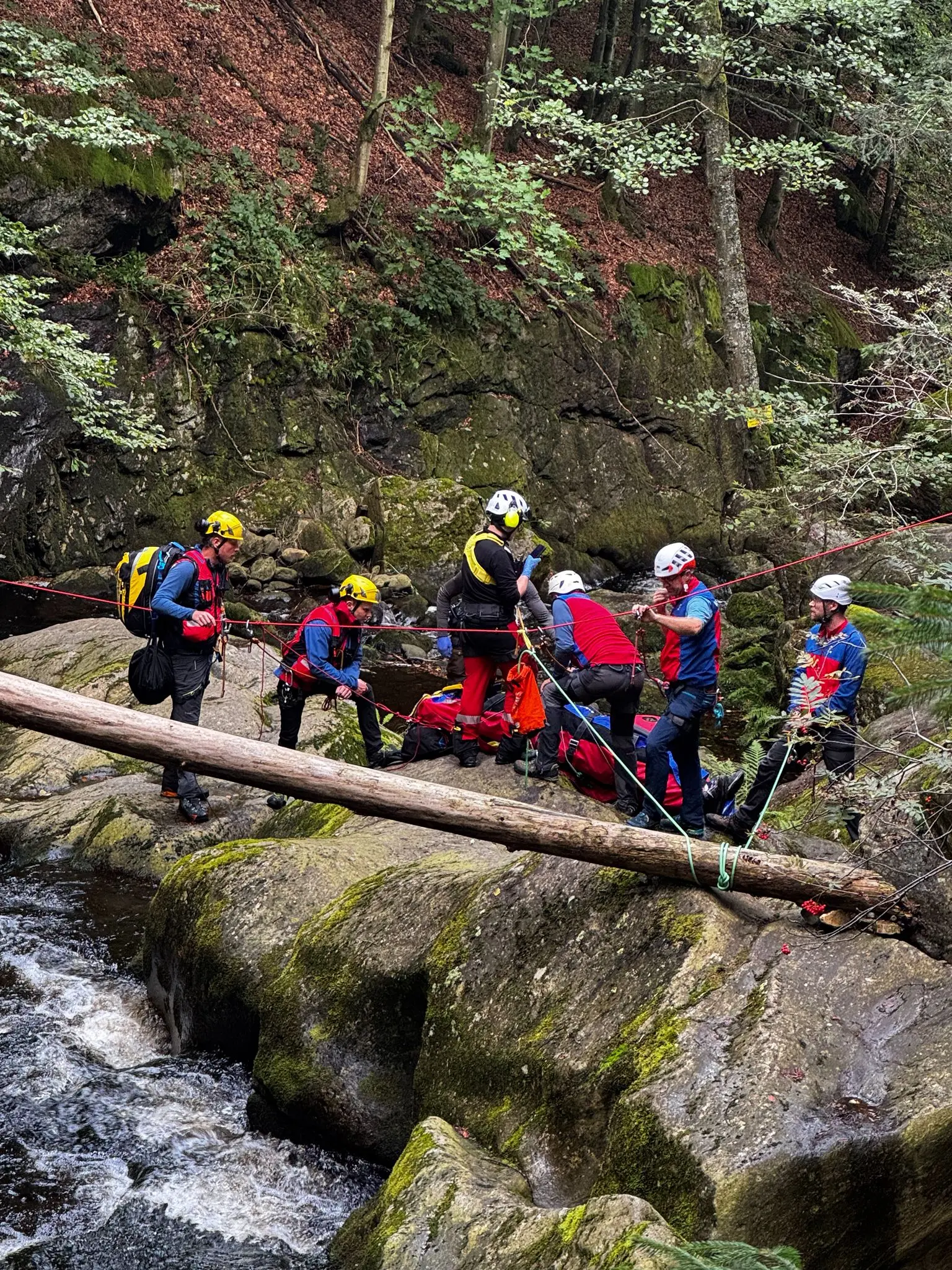 Christoph 15 nach Anflug aus Deggendorf konnte nach mehreren Überflügen die Einsatzstelle lokalisieren und die Notärztin in der Nähe absetzen, welche direkt mit der Versorgung beginnen konnte. Kurz darauf erreichte auch bereits Grafenauer Bergretter den Einsatzort, unterstützte die Notärztin und konnte eine Erste Lagemeldung abgeben. Ein 51-jähriger Wanderer war auf Höhe Marienhöhe am Flusswanderweg auf den nassen Felsen nahe am Fluss gestürzt und mehrere Meter abgerutscht, wobei er eine schwere Beinverletzung erlitten hatte. Der Kamerad vor Ort selbst konnte an einer behelfsmäßigen Sicherung absteigen und forderte umgehend Sicherungsmaterial nach, da der komplette Einsatzbereich durch Nässe extrem glatt war. Vom Bergrettungsfahrzeug aus rückten mehrere Bergwachtler mit entsprechenden Material nach, während parallel zwei Luftretter am Sportplatz Spiegelau aufgenommen und durch den Helikopter direkt an die Einsatzstelle gebracht wurden.